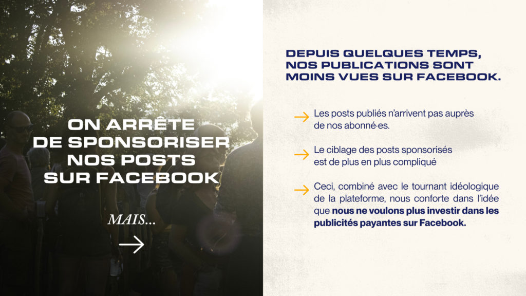 De ce côté-ci de l’Atlantique, le choc fut bien sûr ressenti. Après la vague de désertions de X, bon nombre d’usagers.ères, et notamment d’associations, se sont questionnés.ées sur une posture à adopter face aux deux immenses réseaux que sont Facebook et Instagram, propriétés de META. Assez vite, deux options sont apparues : d’un côté quitter les plateformes et de l’autre y rester pour y faire de la résistance.