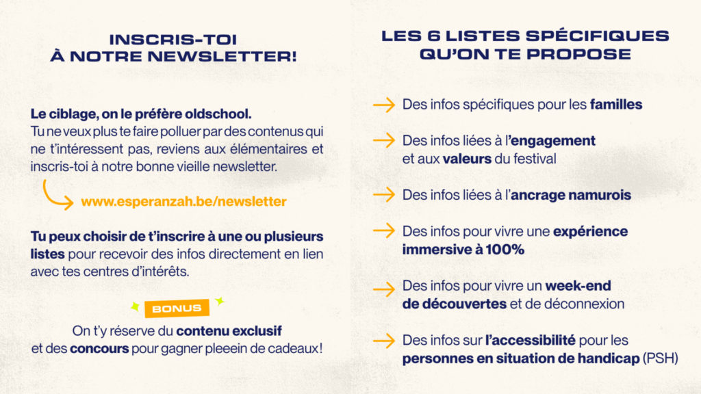 Au-delà du tournant idéologique de META et consorts, la question se pose : qu’a-t-on vraiment à gagner à rester et à utiliser les réseaux sociaux ? Certes, pour beaucoup, une communauté s’est formée, souvent bienveillante, et délaisser celle-ci serait se priver d’un répertoire de contacts et d’un réseau de diffusion. Au-delà de ce public de niche et déjà acquis, l’offre sur ces réseaux s’étant multipliée, la visibilité des acteurs du non-marchand devient de plus en plus faible, et le ciblage de plus en plus difficile. Le fameux support monnayé des publications reste possible pour atteindre une audience plus large, mais la démarche de céder des espèces sonnantes et trébuchantes à META s’avère un pas supplémentaire dans la danse que celles-ci imposent. Ainsi, l’asbl Z, créatrice des festivals musicaux Jyva’Zik et Esperanzah!, a annoncé il y a quelque temps arrêter tout post monnayé sur META, tout en encourageant un ralliement massif de sa communauté à une ou plusieurs newsletters thématiques, en fonction des intérêts personnels de l’audience.